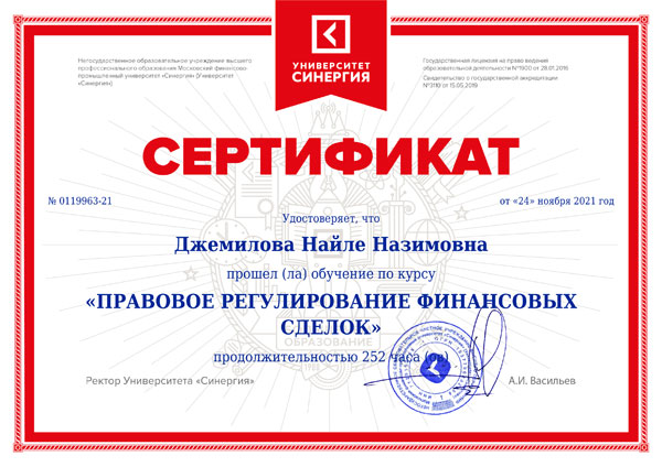 Сертификат обучения правовое регулирование финансовых сделок