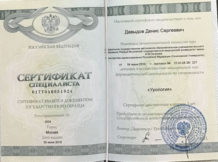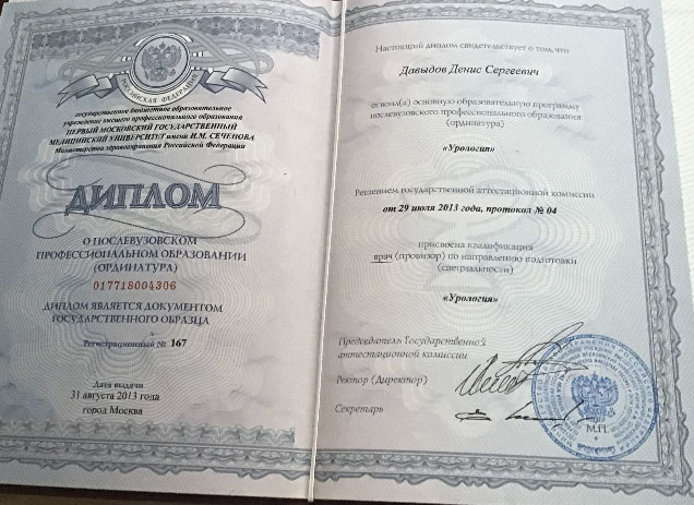 1988 года рождения, окончил с отличием Первый МГМУ им. И.М. Сеченова в 2011 году. В 2011-2013 годах проходил клиническую ординатуру по специальности “урология” в клинике урологии Первого МГМУ им. И.М. Сеченова. С 2013 года по настоящее время работаю врачом-урологом в урологическом отделении №1 Университетской клинической больницы №2 ФГАО ВО ПМГМУ им. И.М. Сеченова (Сеченовский Университет). В 2014 году проходил стажировку в университетской клинике MHH (Medizinische Hochschule Hannover) в городе Ганновер, Германия. В 2018 году защитил кандидатскую диссертацию на тему «Осложнения лазерной энуклеации гиперплазии простаты». Действительный член Российского Общества Урологов (РОУ), Российского Общества Онкоурологов (РООУ), Европейской Ассоциации Урологов (ЕАУ).